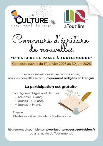 « La culture vous veut du bien » et la bibliothèque « aTout’ire » de Toutlemonde, clubs de l’ACTT (association « Arts Culture et Théâtre à Toutlemonde ») organisent un concours de nouvelles au premier semestre 2026. Le concours est ouvert au monde entier, mais les nouvelles devront être rédigées en français. La participation est gratuite. Pour les participants, trois catégories d’âges sont définies : adultes, jeunes de 14 à 18 ans, jeunes de moins de 14 ans. Pour ces catégories jeunes, il est également possible de participer collectivement au niveau d’une classe.Le jury sera composé de bénévoles de la bibliothèque « aTout’lire ». Des prix, essentiellement sous forme de dons de livres, récompenseront les meilleurs récits dans chaque catégorie. Un prix surprise « Coup de cœur » sera décerné à un(e) auteur(e) toutlemondais(e). Les nouvelles primées seront publiées dans un recueil imprimé et podcastées sur le site laculturevousveutdubien.fr